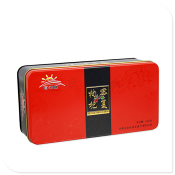 這款長方形枸杞馬口鐵盒,選用單面四色印刷+一專色印刷處理,外過啞油,內過金油,專色印刷外型比四色印刷的效果,更受消費者歡迎。該鐵盒181.5*93.5*60的規格尺寸,適合裝150-250克的產品,您還可按需求定制更大容量的鐵盒。